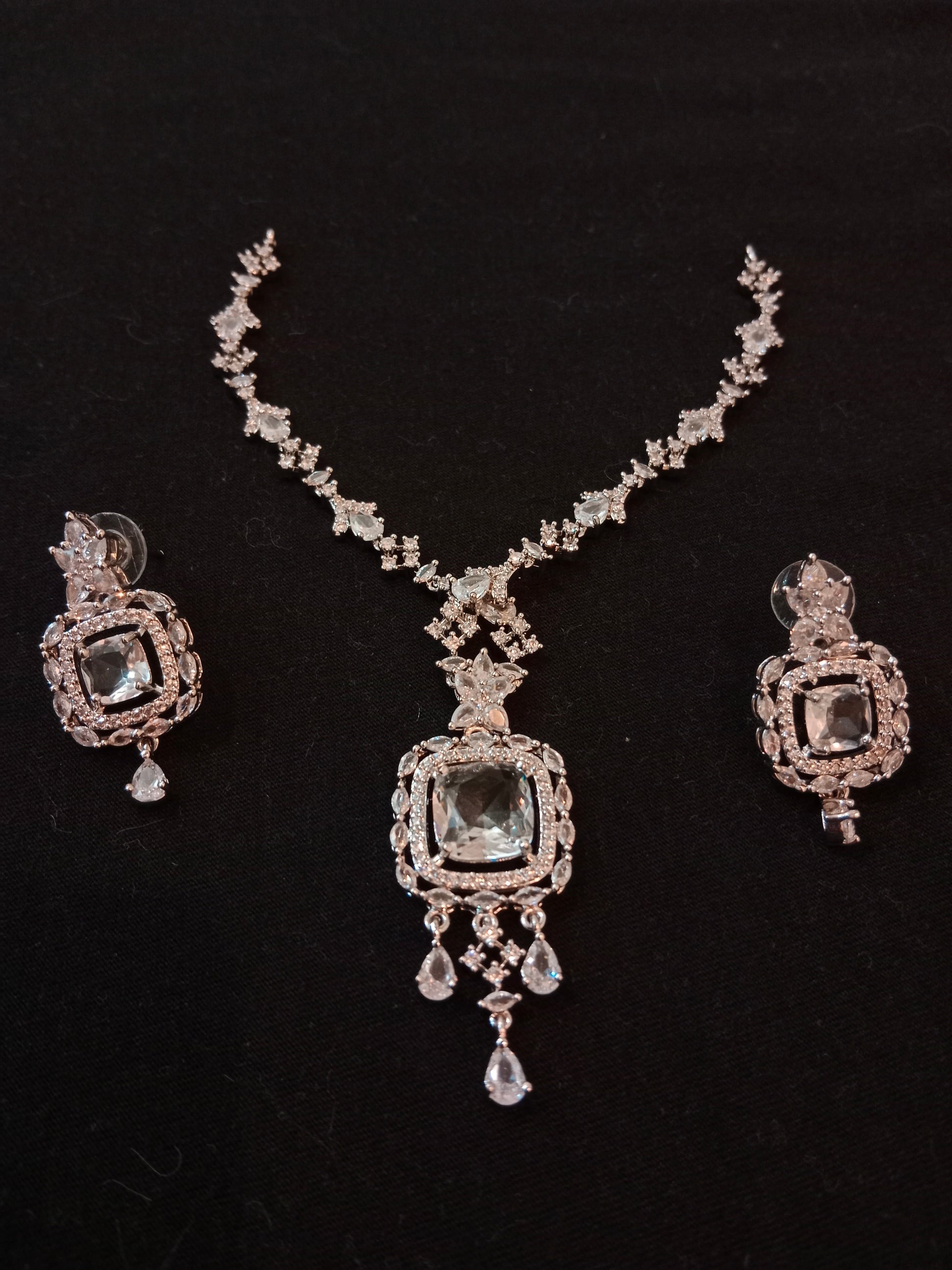Stunning crystal-embellished necklace with matching earrings, featuring square centerpiece design, perfect for weddings and formal events.